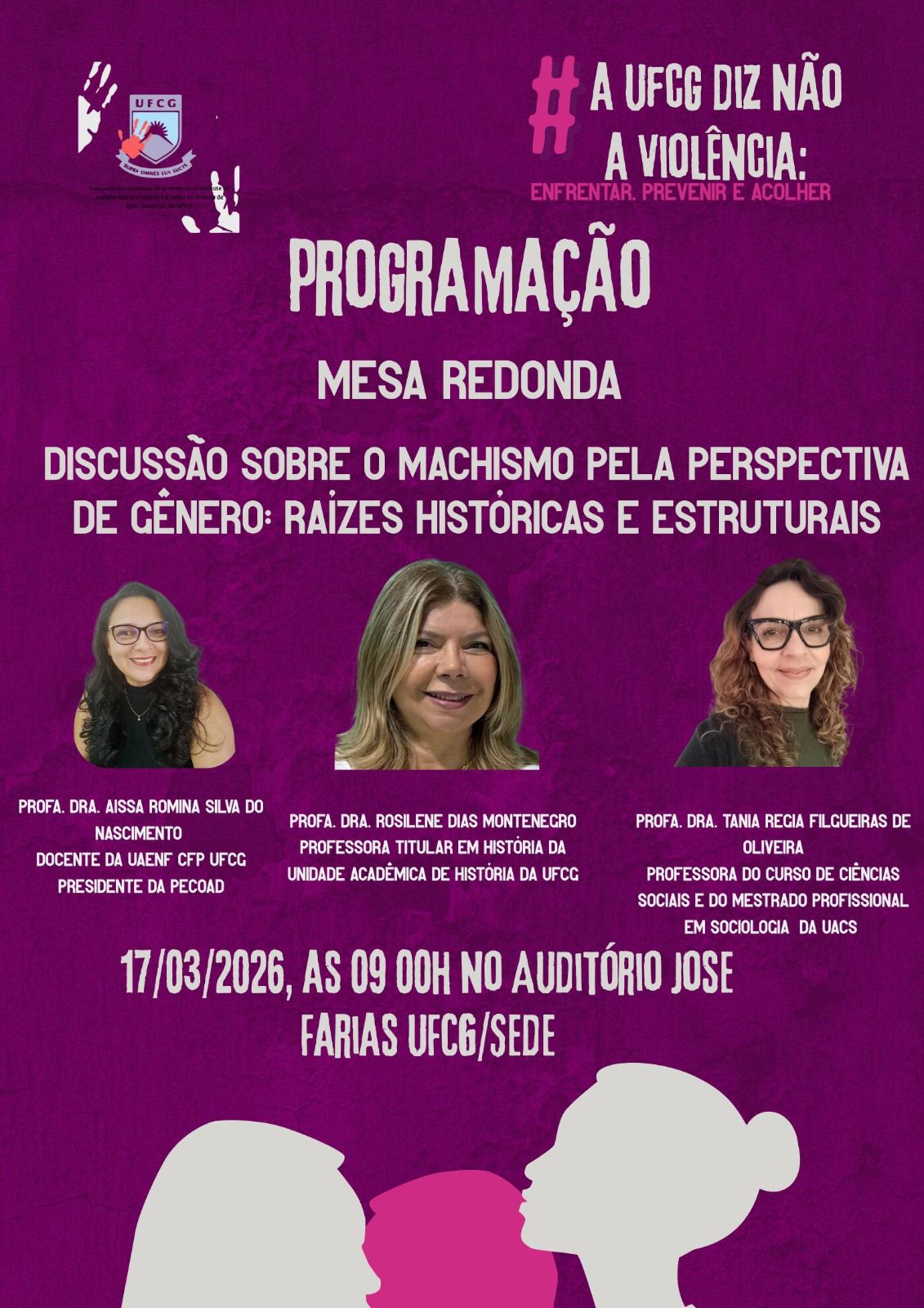 A programação segue no próximo dia 17 de março, no campus sede, às 9h, no Centro de Extensão José Farias da Nóbrega, com a mesa redonda Discussão sobre o machismo pela perspectiva de gênero: raízes históricas e estruturais e participação das professoras Aissa Nascimento, Rosilene Montenegro e Tânia Oliveira.